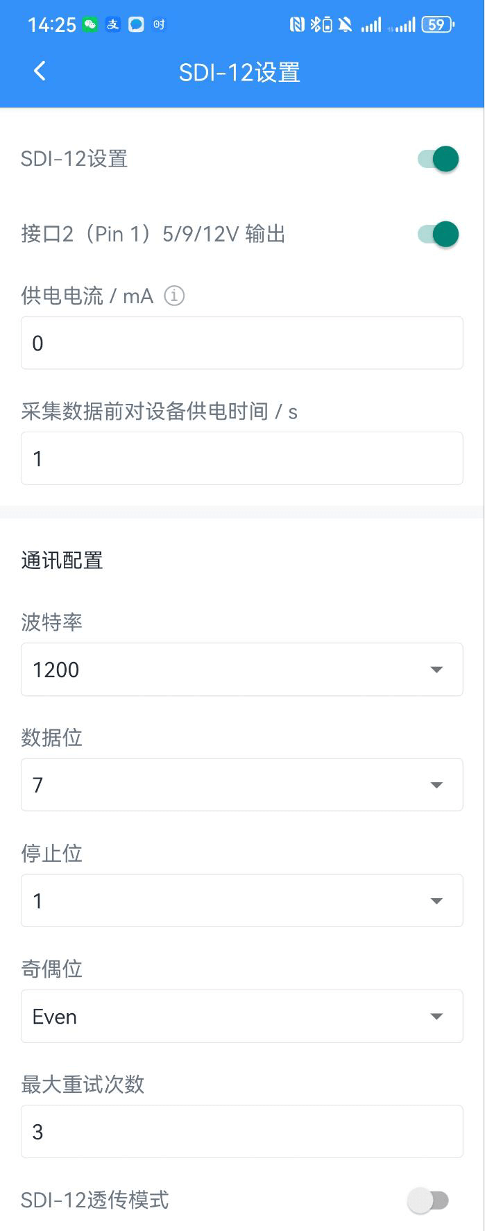 2.3 进入UC50x Toolbox中“SDI-12设置”,根据传感器设置波特率、数据位、停止位等,设置完成保存SDI-12通道设置。(本次设置根据TM5传感器)。