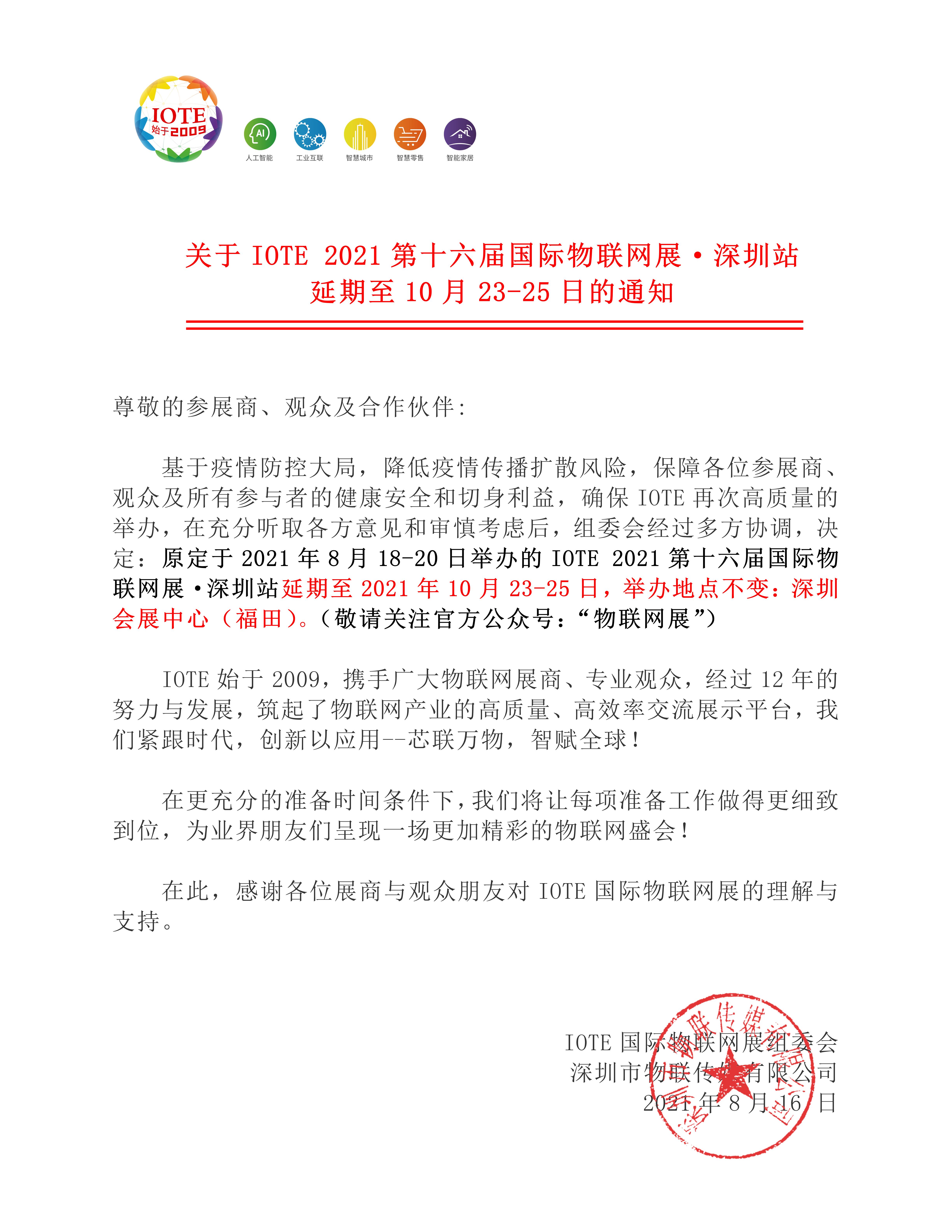 鉴于近期疫情的影响,我们接到主办方通知,原定于2021年8月18-20日在深圳会展中心(福田)举办的IOTE 2021第十六届国际物联网展•深圳站,以及同期的LoRa创新应用论坛将延期举办。
