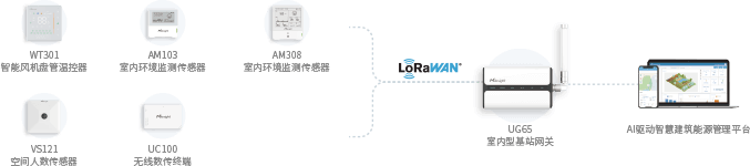 以上传感器和数传终端采集的数据,通过LoRaWAN®无线传输方式将数据发送到UG65室内型基站网关,网关通过MQTT和HTTPS协议无线对接到青衍的AI驱动智慧建筑能源管理平台及数据库。