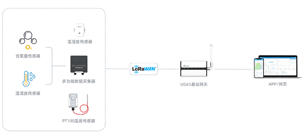 - 2. 空气含氧量对于茶叶的发酵与干燥过程至关重要。本方案中,含氧量传感器与温湿度传感器通过RS485与UC11-N1 LoRaWAN ®多功能数据采集器对接,UC11-N1采用Modbus协议主动采集传感器数据后,再将数据通过LoRa发送给UG65 LoRaWAN ®网关,最后,网关会将数据转发到星纵云进行数据分析,判断当下的环境温度和含氧量是否适宜,当相关参数超过阈值时,立即告警,及时作出应对策略。