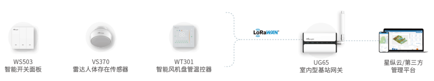 通过室内型基站网关实现办公大楼LoRaWAN®信号全覆盖。传感器和终端设备采集的数据通过LoRaWAN®无线传输方式传到网关,网关再通过MQTT协议对接到第三方管理平台。