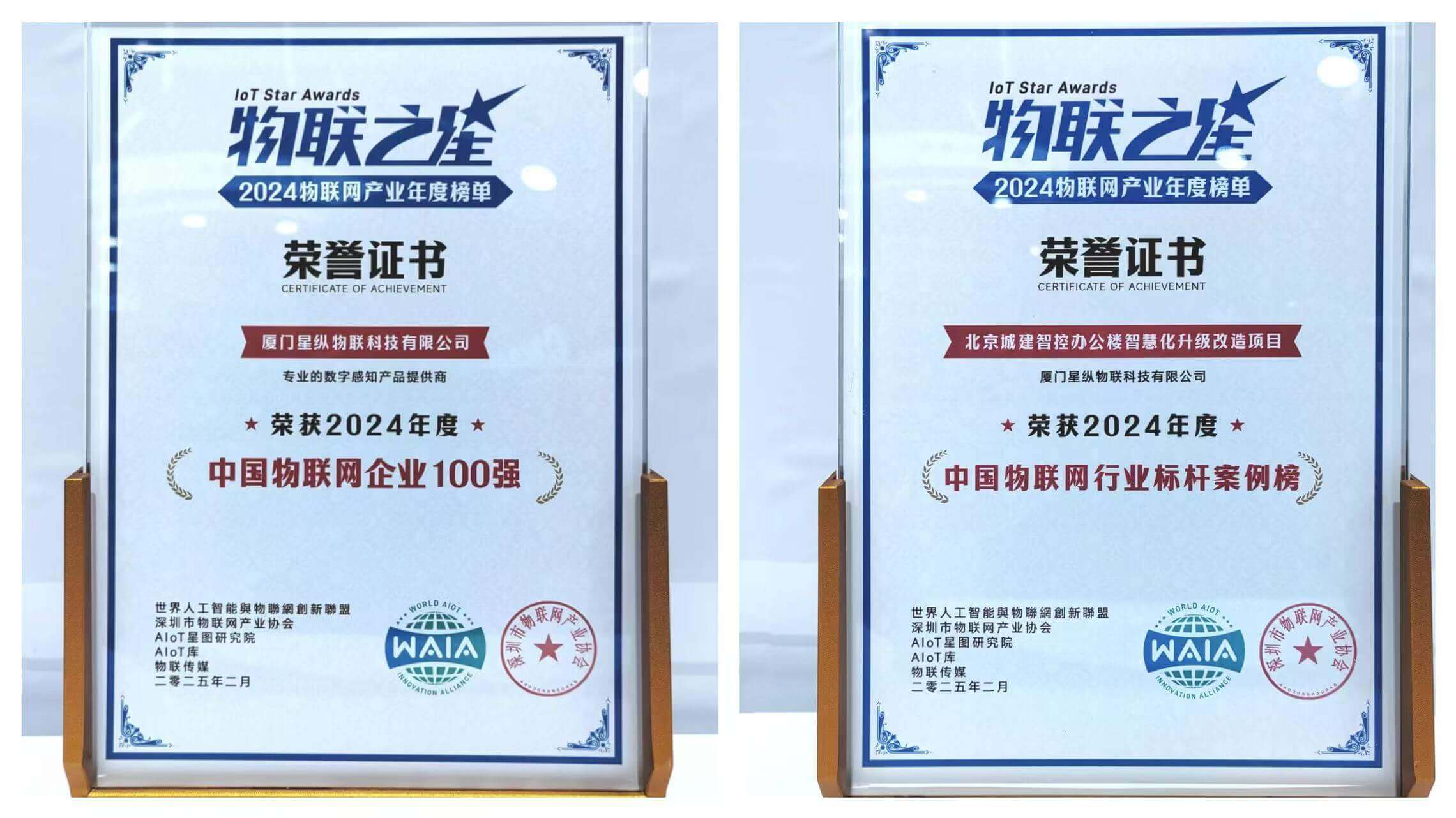 AIoT行业年度盛事—“2024物联之星”年度榜单颁奖典礼于峰会现场同期举行。星纵物联凭借强大的技术实力、广泛的市场影响力和强大的创新能力,在激烈的市场竞争中脱颖而出,荣获“2024年度中国物联网企业100强”称号。同时,星纵物联的《北京城建智控办公楼智慧化升级改造项目》也获得“2024年度中国物联网行业标杆案例榜”。