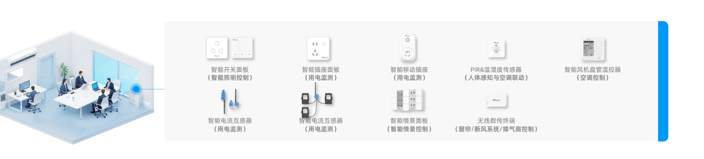通过在会议室和走廊过道分别部署VS370雷达人体存在传感器、WS202 PIR&光照传感器,可实现空间人体感知和灯光联动,实现“人来灯开、人走灯灭”,降低能耗。