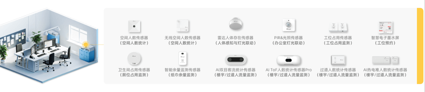 根据会议室/接待室等应用现场空间大小、布线简易程度、对数据影响的及时性等不同需求,按需部署VS121人体存在传感器/VS321无线空间人数传感器,可精准统计指定区域人员数量或反馈空间占用状态,同时将数据接入预约系统,实现空间资源的快速预约与分配、高效利用与智能化管理,全方位提升空间运营效率与用户体验。