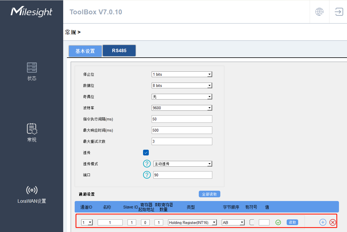在“常规 > RS485”配置页面中勾选“透传”后模式选择为“主动透传”,端口可以使用90,网关或服务器下发指令时将进行透明传输到终端设备。