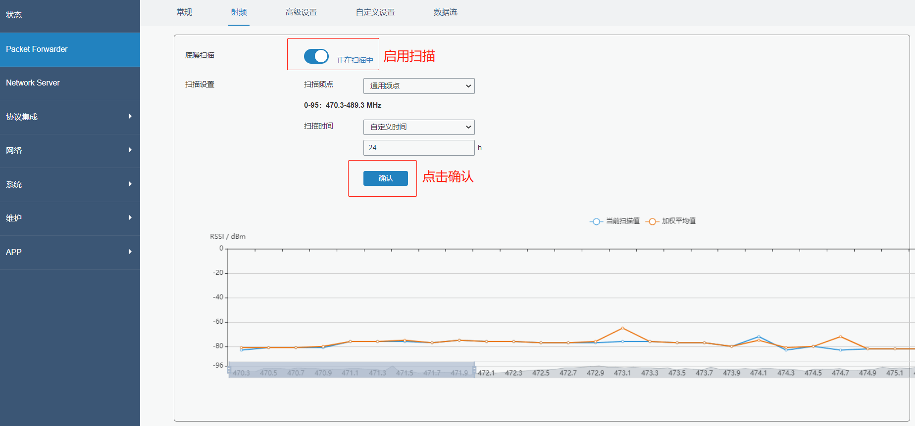 1. 进入“Packet Forwarder> 射频”,点击“底噪扫描”,打开底噪扫描的功能(默认是关闭的),点击确认开始扫描