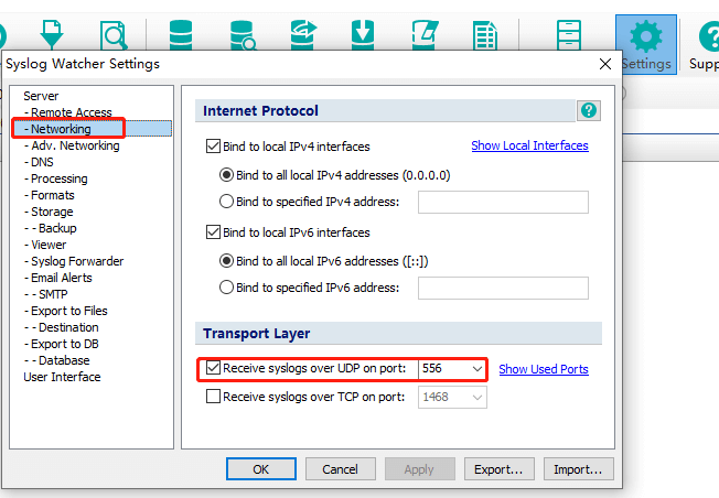 1.打开Syslog Watcher工具,点击【setting】-【Networking】设置端口号,自定义不冲突的端口号即可。