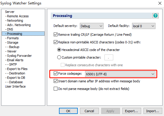 2.点击【processing】,修改编码格式为UTF-8,不然可能会出现日志乱码问题。