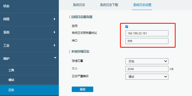 3.前往路由/网关后台日志网页设置界面,设置远程日志服务器地址和端口。