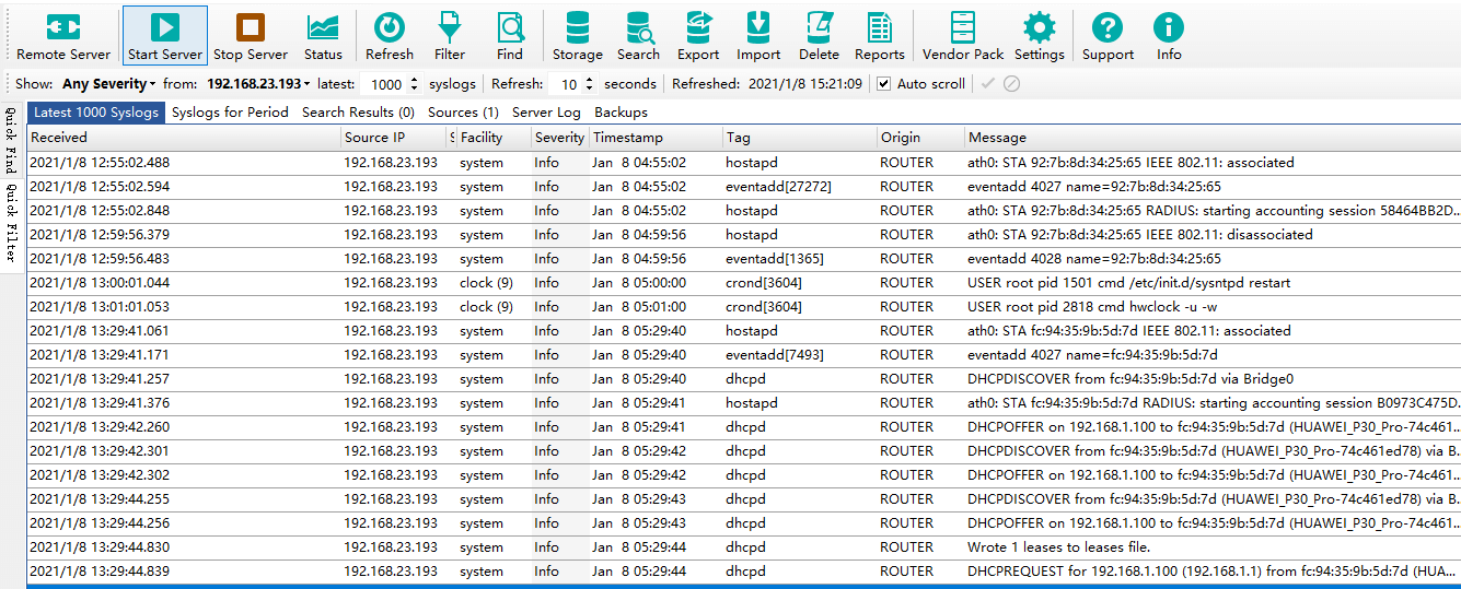 服务器地址:安装Syslog Watcher工具的电脑IP(和路由/网关同网段)。