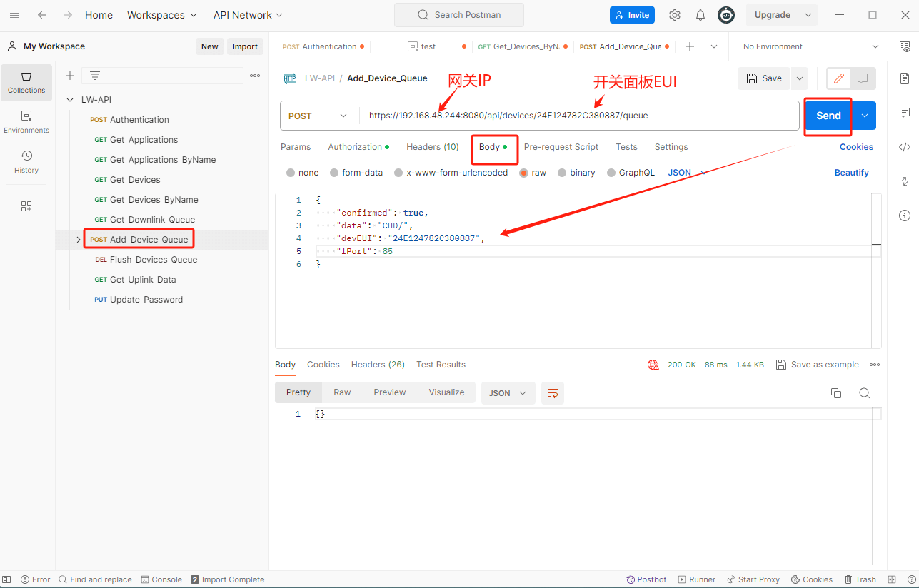 - 点击进入“Add_Device_Queue>Body”,可以通过此附件API向传感器发送相关的下行指令,配置相关参数,然后点击send即可在网关NS上看到下发的对应的数据流。